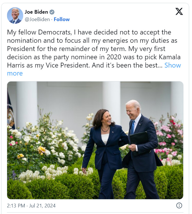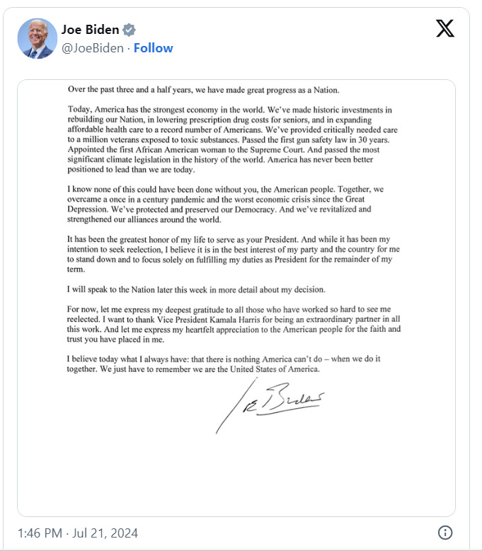 在其X(前Twitter)账户上,他发布了一封信,表达了自己担任总统的荣耀。他写道:“成为你们的总统是我的人生最大荣幸。我曾计划寻求连任,但我相信,退出竞选并全力以赴履行我的职务,对我的政党和国家最为有益。”