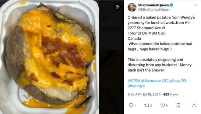 一名加拿大网友分享称,她在Wendy's购得的烤土豆中,竟发现了大虫子!