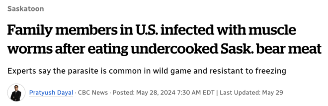萨斯喀彻温大学环境与可持续发展学院的副教授表示,食用未煮熟的熊肉、野猪肉及海象肉可能会导致旋毛虫病的感染。