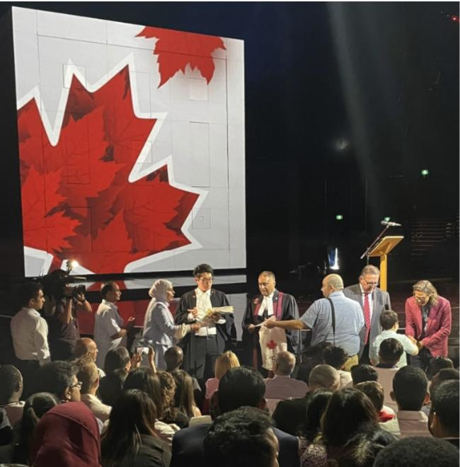 米勒亲自欢迎了来自60个国家的368名新公民,他们在全球知名的马戏团大帐篷下宣誓效忠于加拿大。而当日也恰逢太阳马戏团成立40周年的庆祝活动。