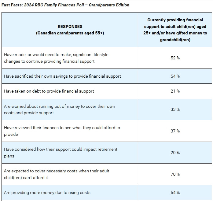 根据《财经邮报》的报道,皇家银行RBC发布了一项新研究,揭示了许多加拿大祖父母在经济上的负担,因他们正在为成年子女和孙辈提供支持,冒着自己的财务风险。
