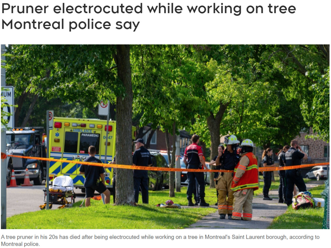 蒙特利尔警方(SPVM)确认,一名20多岁的树干修剪工在Saint Laurent区进行树木修剪工作时不幸遭遇触电,导致身亡。