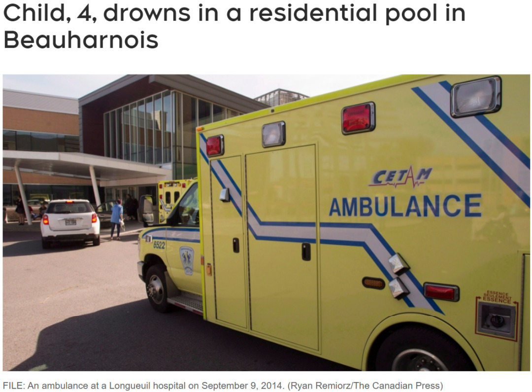 周四的晚上,在Montérégie地区Beauharnois的一处私家游泳池发生一起悲剧,一名四岁孩子溺水身亡。事故发生在晚上8点30分左右,紧急服务部门接到报案,称一名儿童在游泳池中因不明原因失去意识,心肺功能出现骤停。