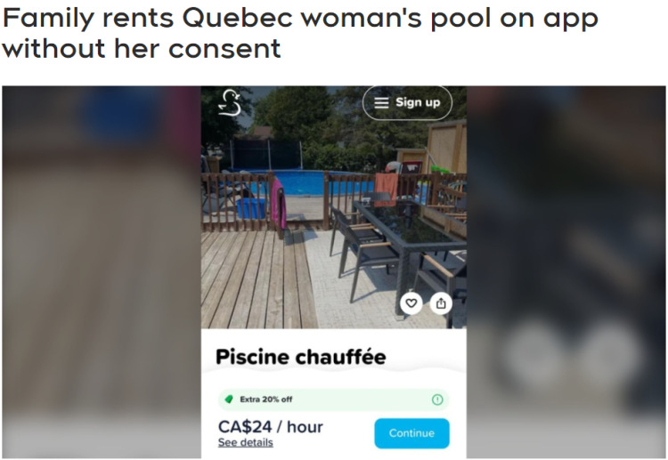 上周日,居住在蒙特利尔东部Repentigny的一位女士回到家时,惊讶地发现有五个陌生人在她的泳池边举办泳池派对。在询问后,她得知这些人是通过一个名为Swimply的应用程序租用她的泳池,而她对此毫不知情,也未给出过任何同意。