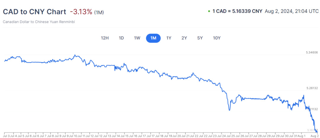 加元对人民币的汇率也经历了显著下滑,目前1加元兑换5.1633人民币。
