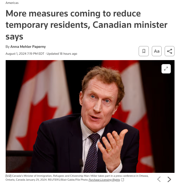 米勒进一步表示,加拿大人“期待有一个合理的系统,他们希望这个系统能够保留我们一直以此自豪的迎接新移民的态度,同时必须是合乎逻辑的。”他预言移民议题将在预计于2025年举行的下一届选举中成为“一个主要问题,甚至是最重要的问题”。