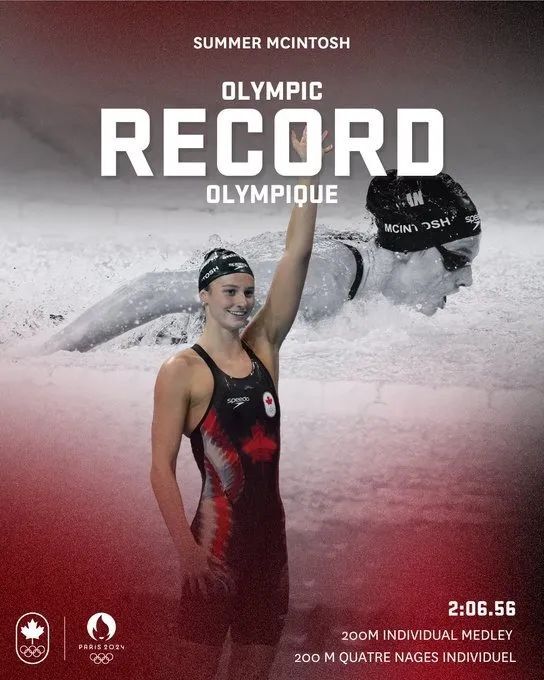 来自加拿大的年轻游泳天才萨默·麦金托什(Summer McIntosh)在巴黎2024奥运会上成功赢得她的第四枚奖牌,夺得了女子200米个人混合泳的金牌。