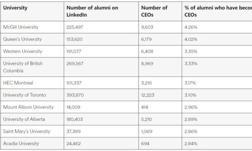 该机构对全球200多所顶尖学府的LinkedIn数据进行了全面梳理,以探讨校友获得首席执行官身份的比例。 研究包括了对加拿大排名前50的高等院校的评估。