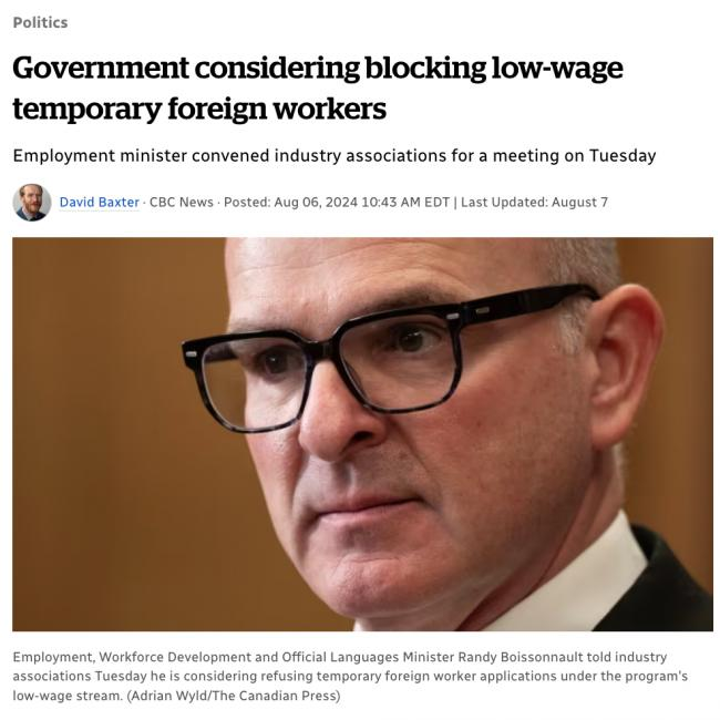 加拿大就业和劳动力发展部长Randy Boissonnault的办公室透露,周二他在与商业协会的会上指出,联邦政府正在考虑拒绝那些工资低于规定标准的临时外国工人(TFW)申请。