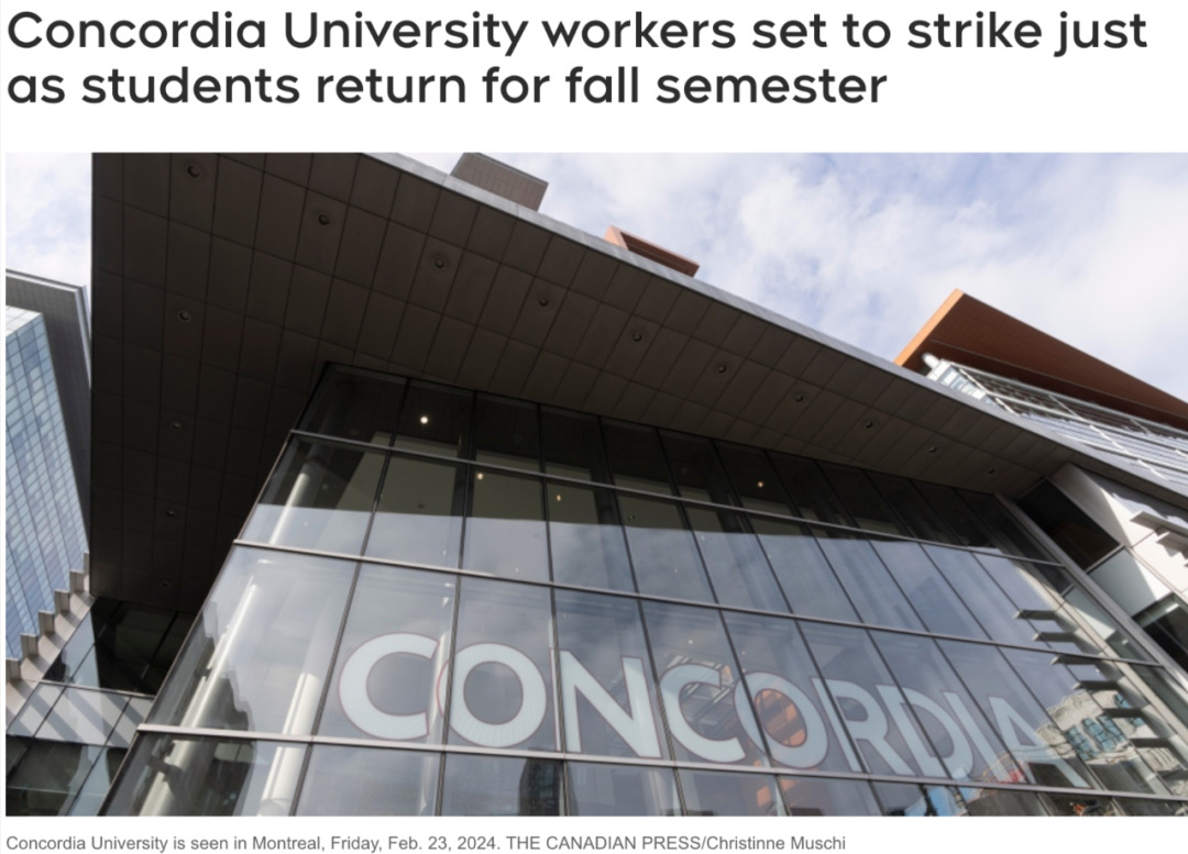 蒙特利尔的康考迪亚大学(Concordia University)数百名员工计划在九月举行罢工,恰逢秋季学期学生返校之际。康考迪亚大学职业雇员工会(Syndicat des employé-e-s professionnel-le-s de l’Université Concordia,缩写为SEPUC-CSN)宣布,与雇主的谈判未能达成共识,因此600名员工将于9月3日实施罢工。