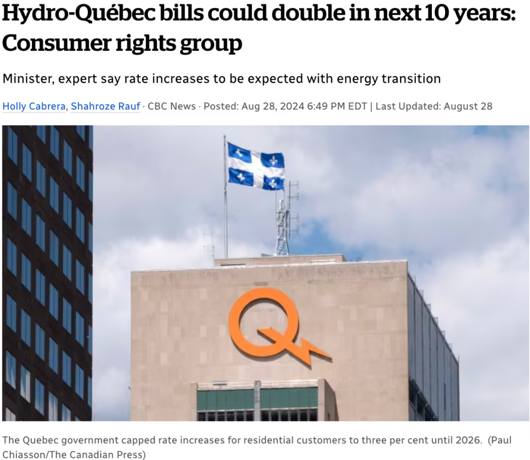 去年,魁北克省政府规定,在2026年前,住宅用户的电费涨幅不得超过3%。
