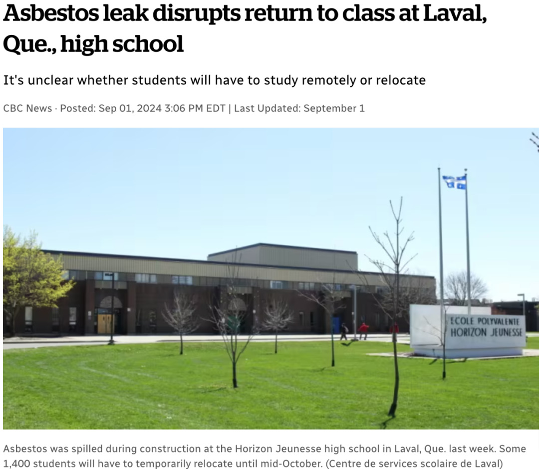 位于魁北克省Laval市的Horizon Jeunesse高中因发现石棉纤维而暂停到10月中旬的教学,这一决定影响了约1400名学生的返校计划。石棉是在上周的施工中意外泄露的。目前尚不清楚学生们是需要在家进行远程学习,还是会被安排到其他学校上课,直到环境得到净化。