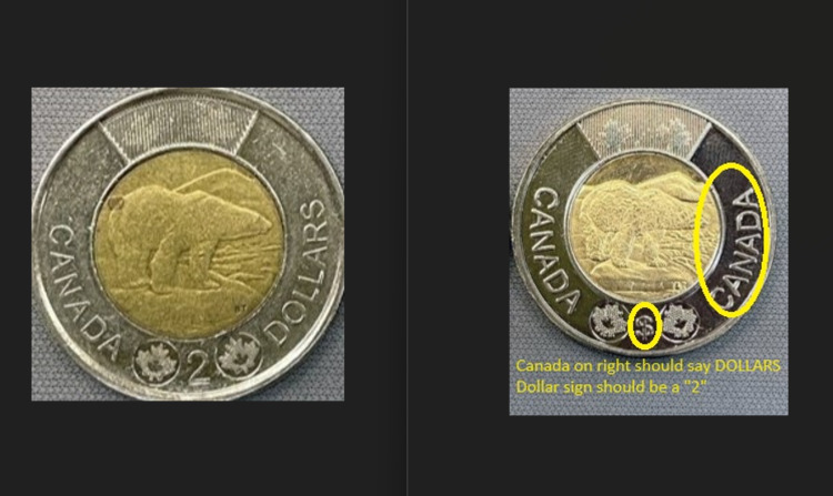 在2022年5月,加拿大皇家骑警(RCMP)逮捕了来自安大略省列治文山的68岁男子何代雄(Daixiong He),指控他持有和使用假币。皇家骑警在调查中查获了1万枚假冒的2加元硬币,案件被称为“驼趾2加元硬币”案。