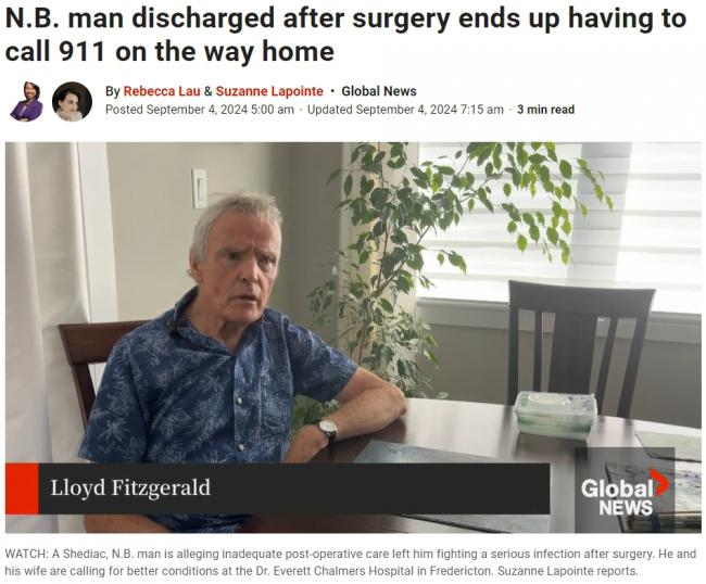新不伦瑞克省的一名男子在医院完成手术后不久便被迫出院,途中摔倒,妻子对此事件表示愤怒,并批评加拿大的医疗体系像“第三世界”。 据《环球新闻》的报道称,83岁的劳埃德·菲茨杰拉德于6月25日在新省弗雷德里克顿的埃弗雷特查尔默斯医院接受了艾滋病手术。虽然手术过程一切顺利,但他认为自己已经过早出院并且没有得到适当的后续护理,导致严重感染。他和妻子伊芙琳·帕奎因都认为医院的判决护理存在明显不足。