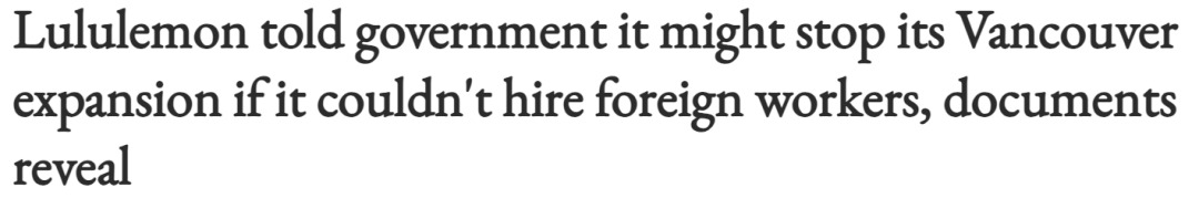 今年年初,允许加拿大及卑诗省政府Lululemon在不要求首先尝试招聘本国居民的情况下,短期雇佣特定外籍工人。