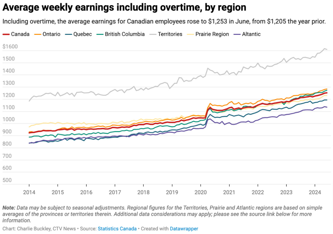 根据加拿大统计局最近发布的报告,6月份,加拿大人的平均周收入为$1,253,此数据与前几个月保持一致,但相比去年同期则上升了4%。