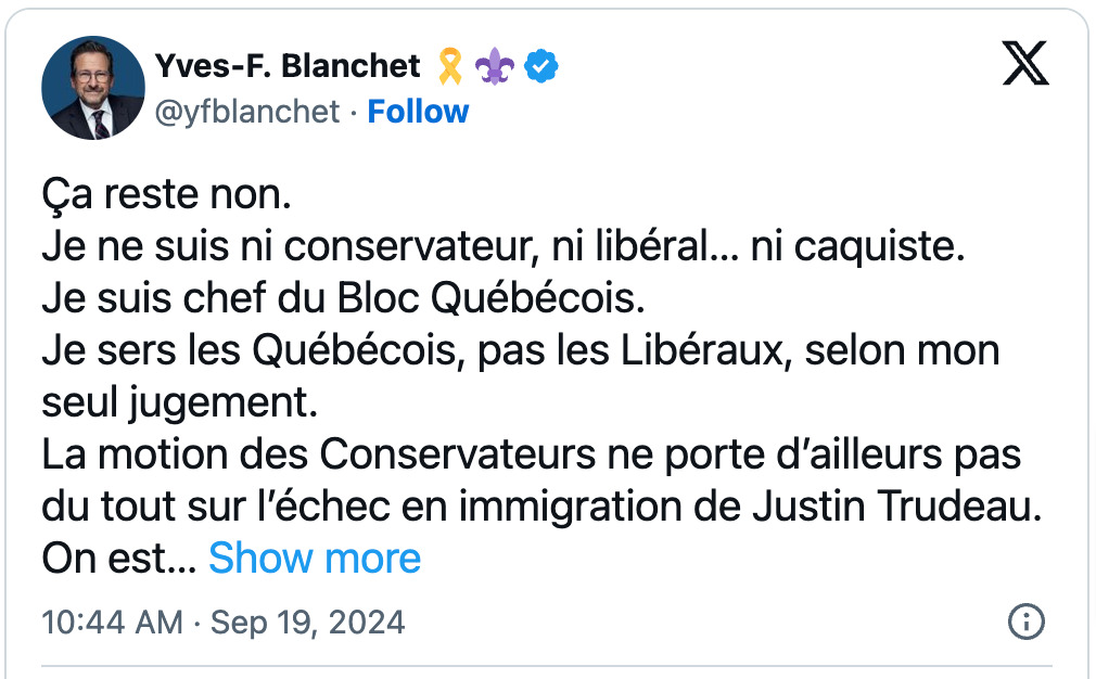 在省长发表上述言论后不久,魁人政团党领Yves-François Blanchet通过X平台表示,他不会投票推翻特鲁多,并强调他“根据我自己的判断”致力于服务魁北克人。