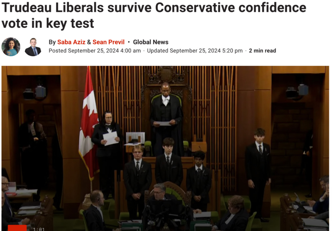 今天是周三,加拿大总理特鲁多在本季首次信任投票中成功保住了自己的位置。