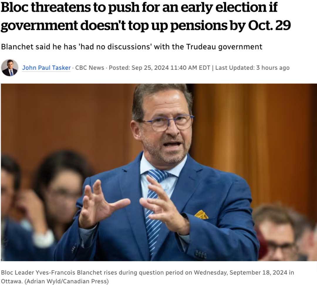 魁人政团设定的最后期限是在10月29日,要自由党通过涉及老年保障金(OAS)和供应管理的两项立法。