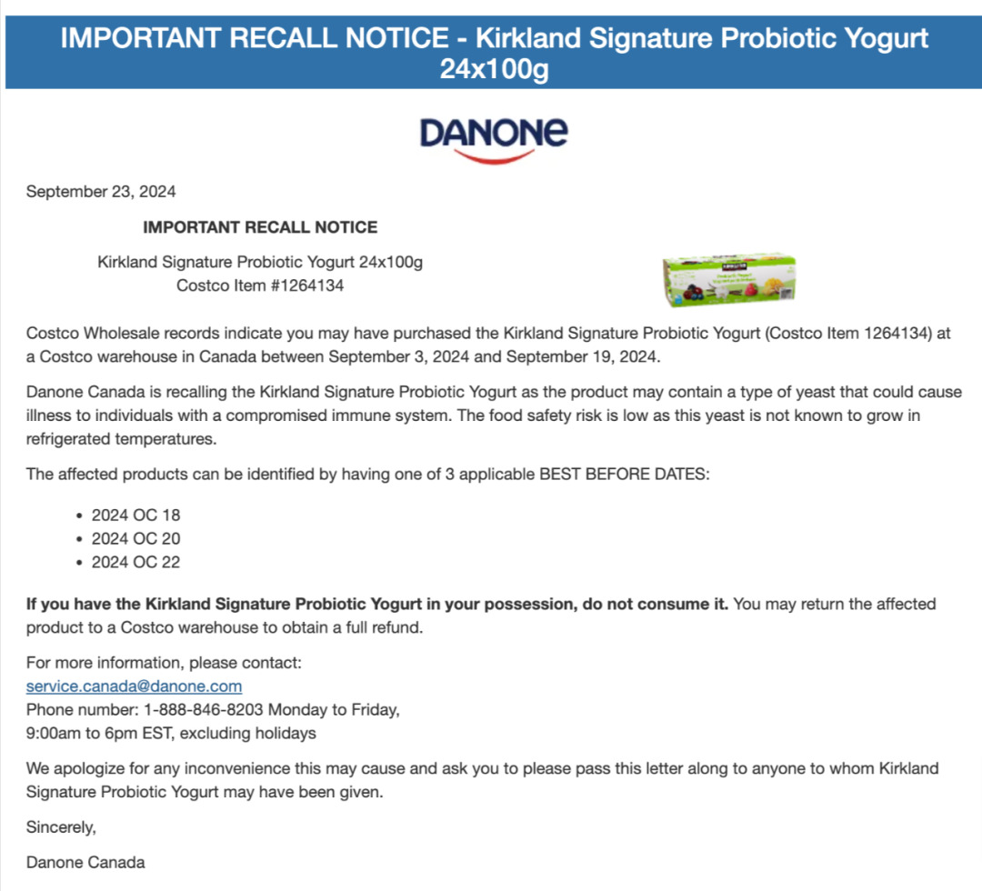 注意!Costco加拿大再度发布酸奶召回公告。