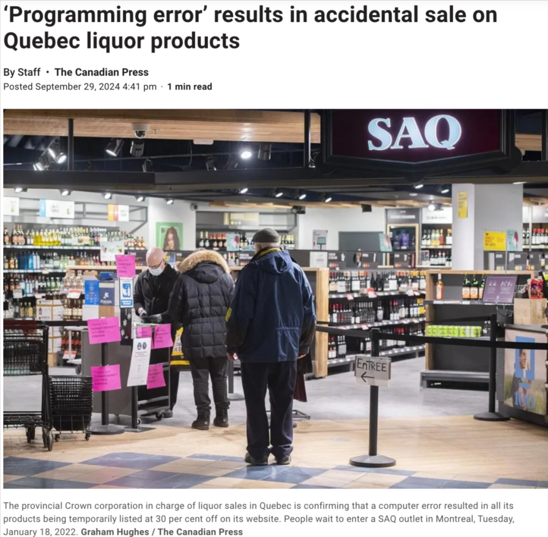 魁北克省的酒类销售连锁机构(Société des alcools du Québec,简称SAQ)近日表示,由于系统故障,其官方网站上所有商品曾在一段时间内以七折价格出售。