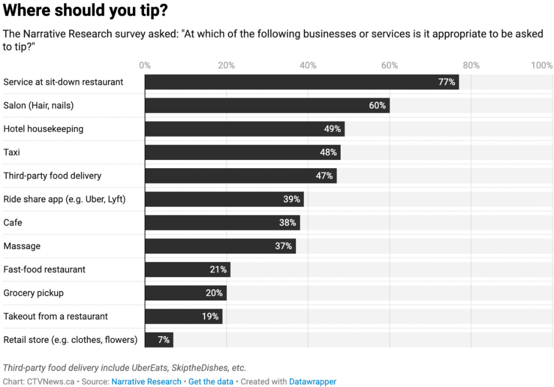 在所有的行业中,只有7%的参与者认为零售店索要小费是合理的。而对于快餐店、餐馆外卖及杂货挑选服务,约80%的受访者表示他们并不打算给小费。