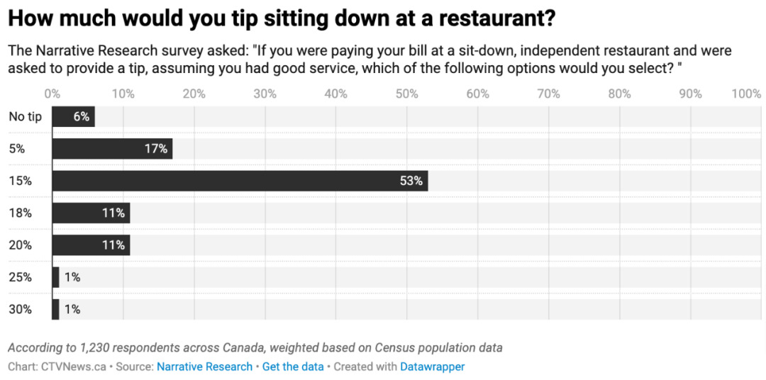根据2023年安格斯-里德(Angus Reid)的一项调查,加拿大人感受到越来越多的场合要求给小费。虽有“小费膨胀”的现象,大多数人仍认为15%的小费是在账单上添加的合适数额。