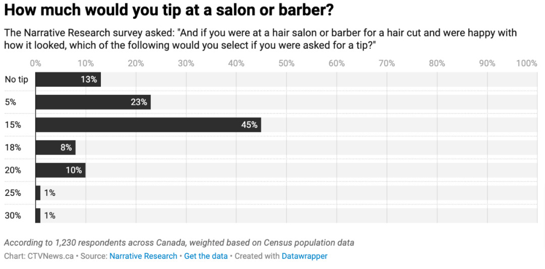 调查显示,77%的加拿大人没有异议于在餐馆就餐时支付小费。此外,许多人也支持在美容院给予小费,接近一半的受访者认为酒店的客房服务、出租车及送餐服务也应获得额外的小费。