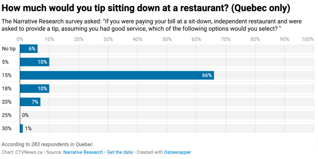 在魁北克,受访者对15%小费的认可度尤为明显,近三分之二的参与者认为该比例是可以接受的。
