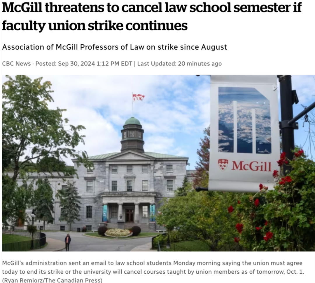 周一上午,校方通过电子邮件通知法学院的学生,若工会不愿意结束罢工,学校将于明天起取消工会成员教授的课程。