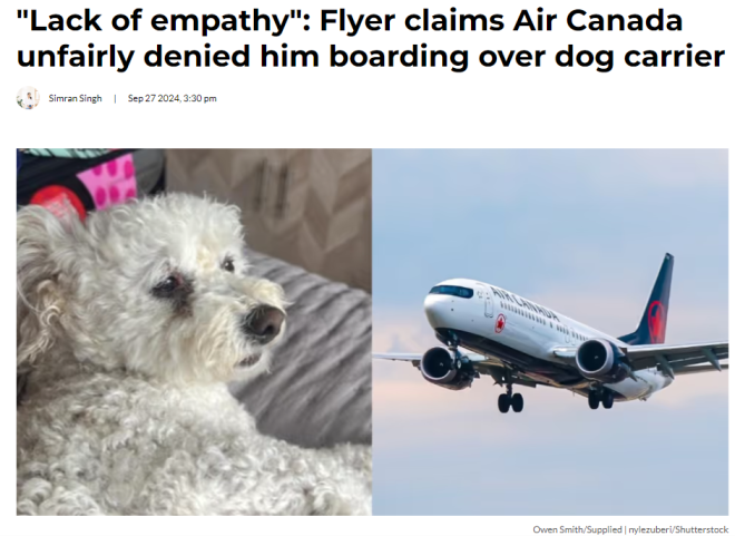 一位来自加拿大的男子声称,他在加航的航班上经历了一次令人尴尬的事件——航空公司拒绝了他、他的妻子以及他们的小狗登机,原因在于工作人员对宠物笼尺寸的争议。