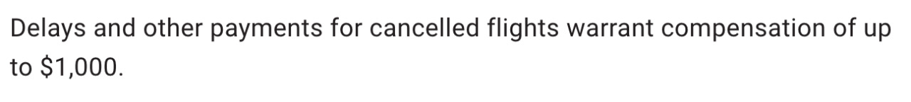 因航班取消所导致的延误及其他费用,最高可获得1000加元的赔偿。