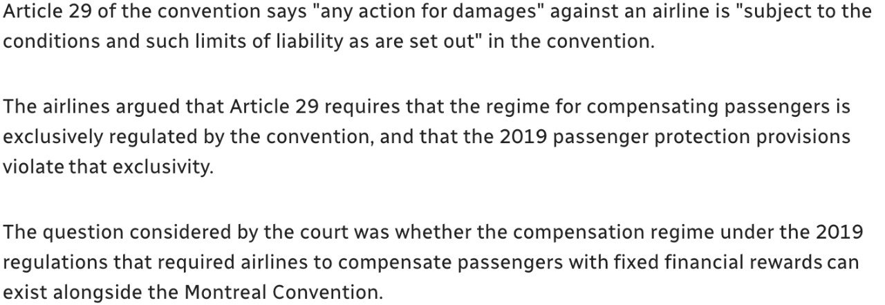 航空公司主张,第29条对乘客的赔偿制度由公约特别规定,而2019年的乘客保护条款则违反了这一专属性。