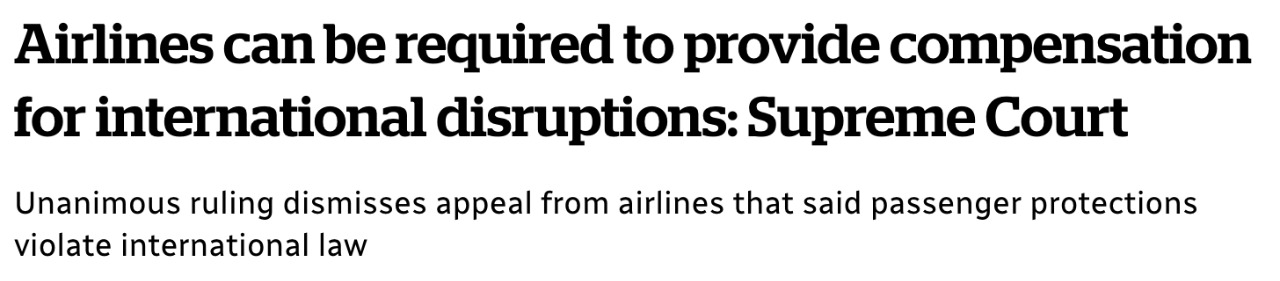 最近,加拿大最高法院就航空旅客权益做出了具有重大意义的裁决,该裁决要求航空公司依据加拿大运输署的规定,对国际航班出现中断的乘客进行更多补偿。