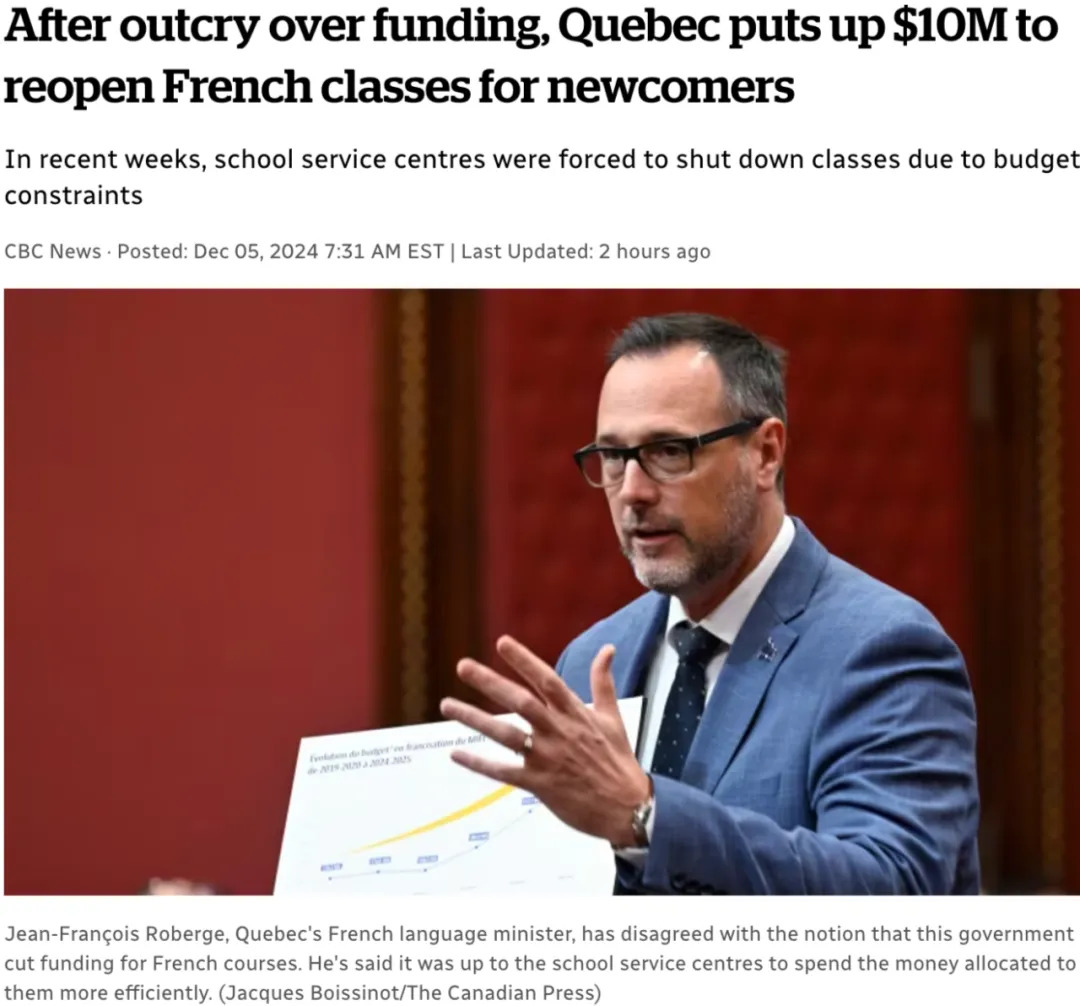 Roberge指出,虽然并没有实施经费削减,资金是存在的,但需要更有效的管理。学校服务中心也表示,语言培训的预算未能跟上不断增长的需求。