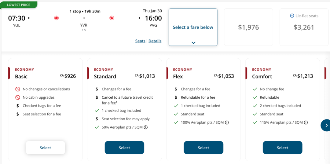 新规已经生效,记者在加航官网上查询了从蒙特利尔至上海的航班,发现如果现在购买经济舱基本机票,托运行李将需要额外支付费用。此外,该票价还不允许更改、取消,甚至无法进行升舱,座位选择也需要额外收费。