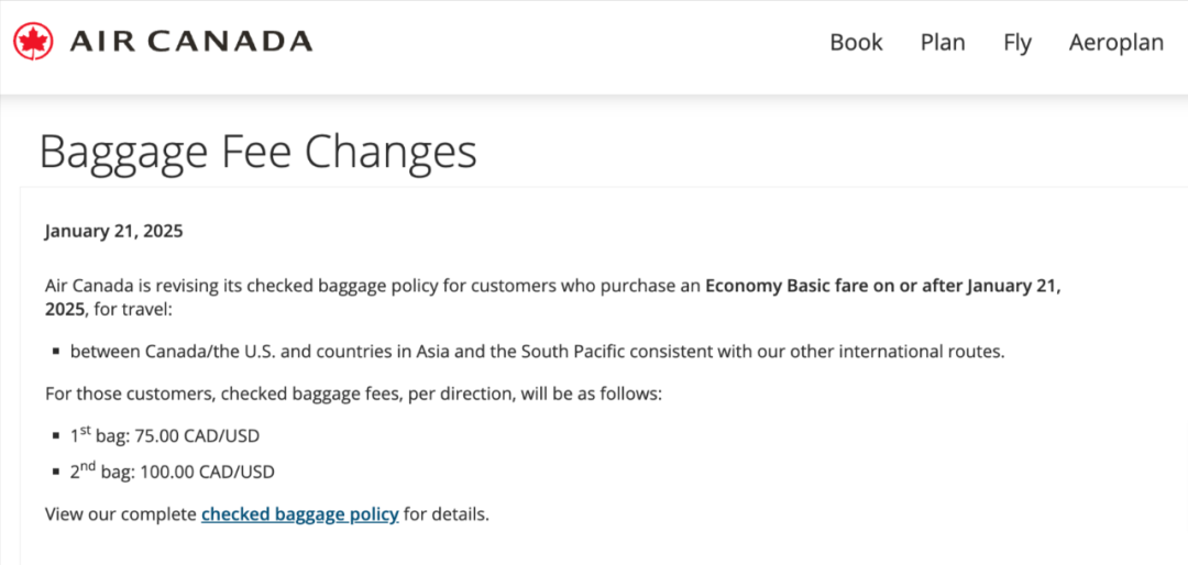 - 第一件托运行李收费:75.00 CAD/USD